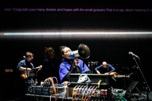 The piece takes an anti-rationalist approach, grounding itself in soft, “feminine” qualities like vulnerability and emotionality. It celebrates intuitive choices and the transformative processes that can happen when one is lost. In this glorious space of “not knowing,” the performers present a sonic roller-coaster that moves through dramatic song, delicate soundscapes, no-wave saxophone chaos, drones and ritualistic feedback, post-punk noise, and pounding tekno beats.