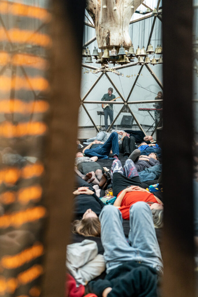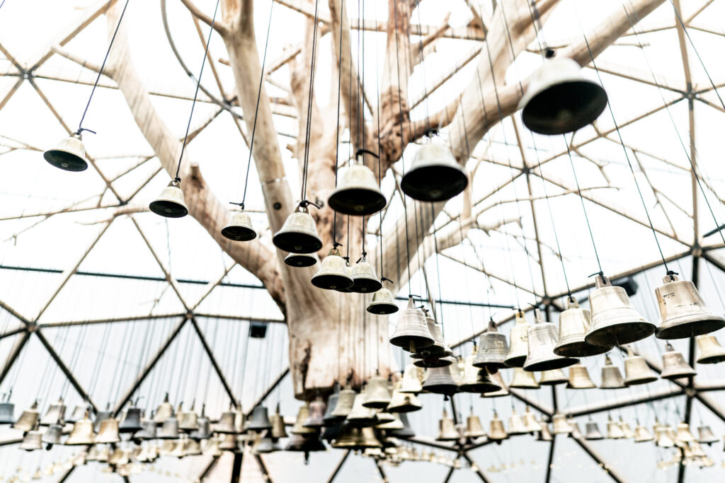 Roerloos is an impressive installation by Sara Vrugt. This interactive artwork invites you to become part of the experience yourself. As a visitor, you lie beneath a chestnut tree with roots made of hundreds of bells. When you lie completely still, the tree begins to speak. Music, stories, and natural sounds invite you to reflect on the relationship between humans and nature.